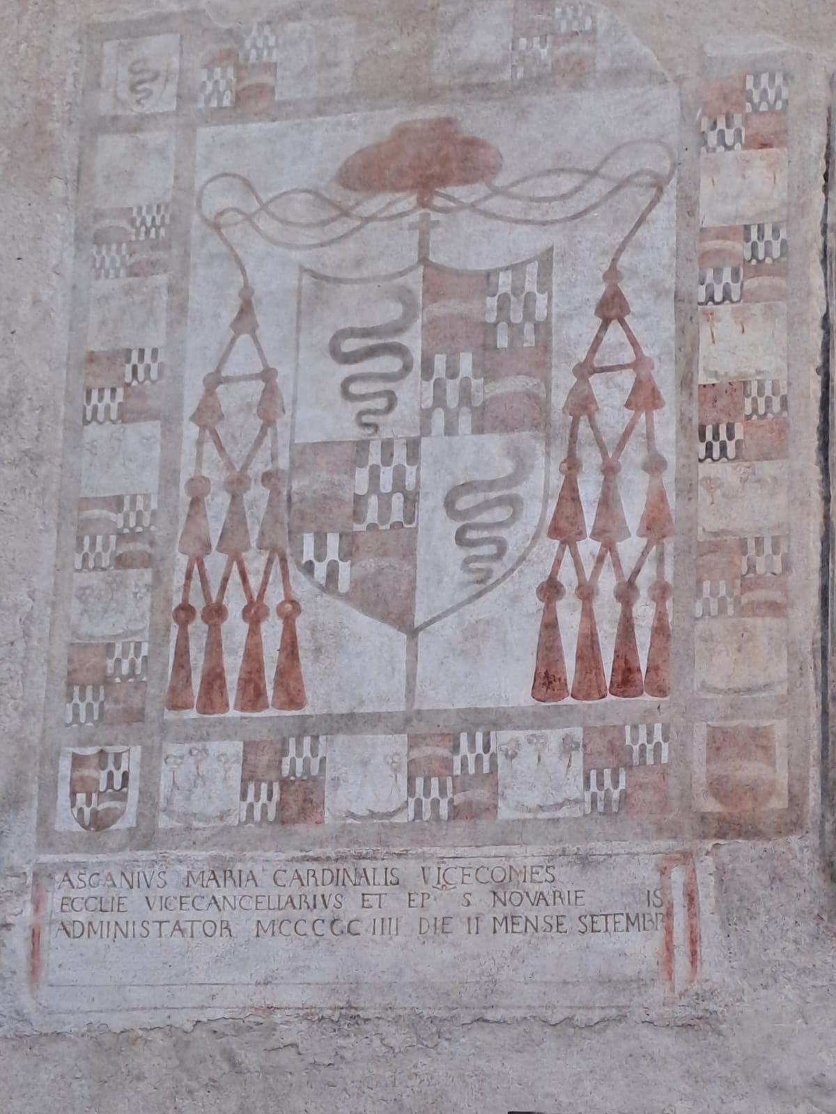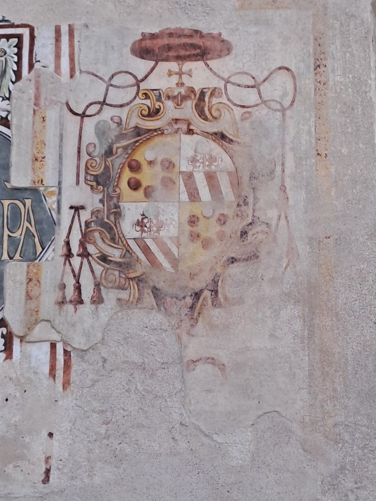 Scudo cimato da croce semplice trigogliata in palo e sormontata da cappello e quattro ordini di nappe.