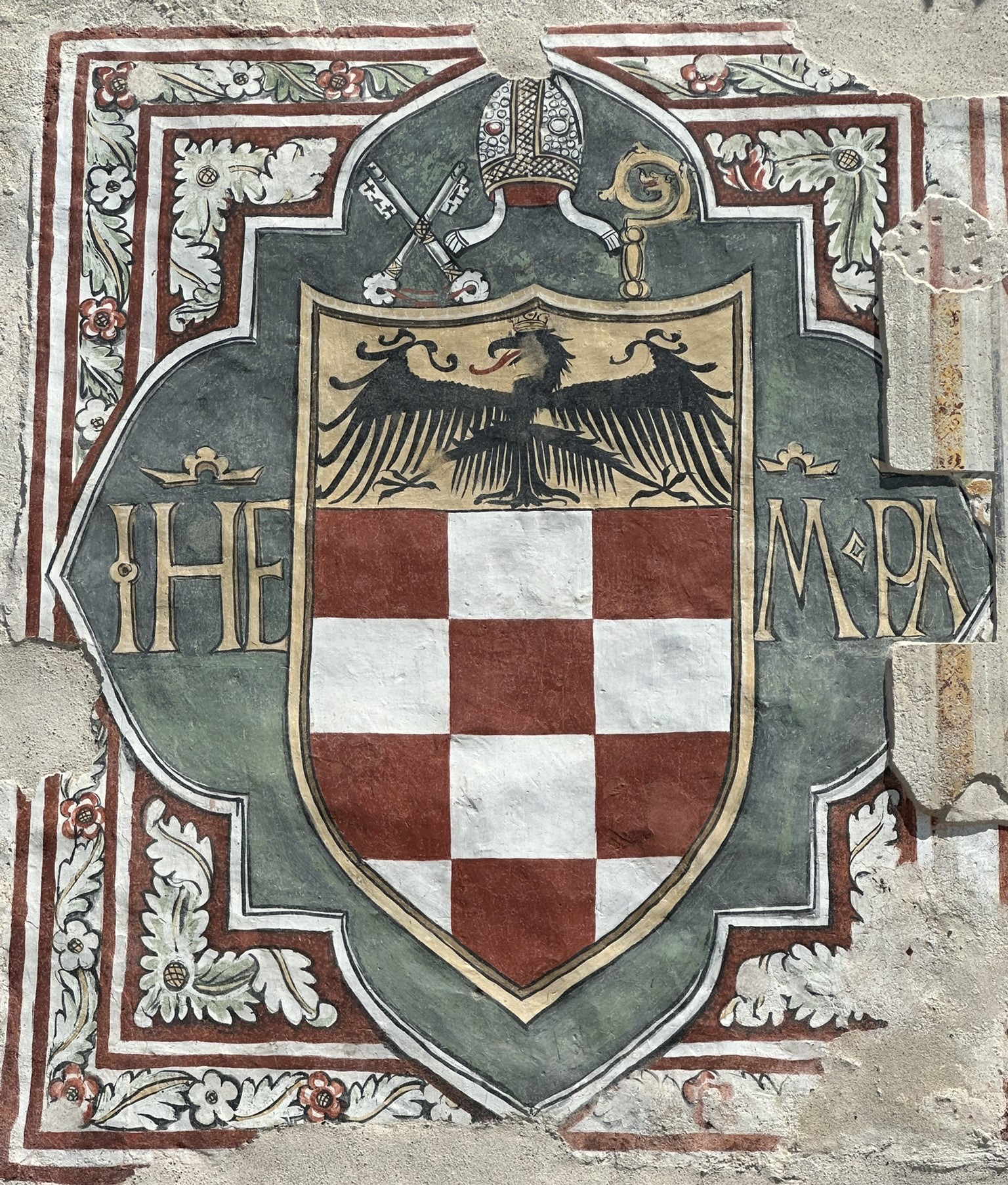 Scaccato di 5 punti di rosso equipollenti a 4 d'argento col capo d'oro all'aquila coronata spiegata di nero